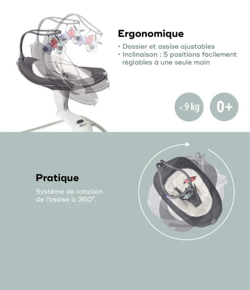 - La balancelle complète : 5 vitesses de bercement, programmation (10, 20 ou 30 minutes), 3 positions d'assises pour chaque moment de la journée de bébé, assise rotative à 360, 8 mélodies.