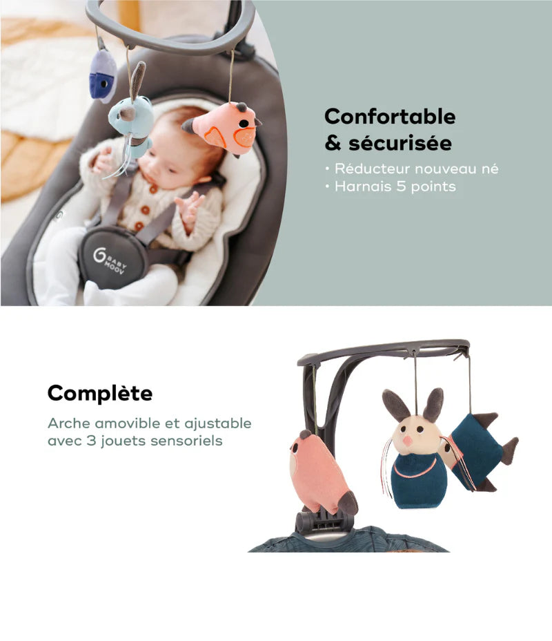 La balancelle électrique idéale pour apaiser bébé avec ces 2 modes de bercement et son détecteur de mouvement.