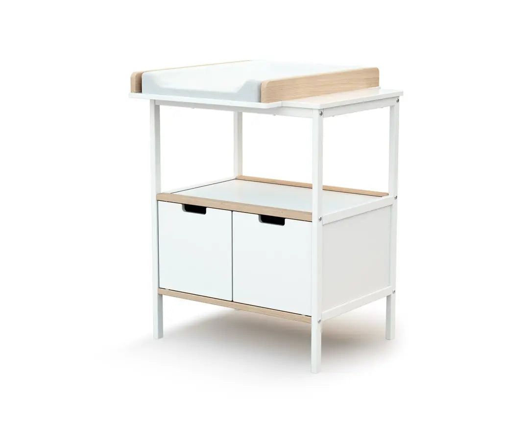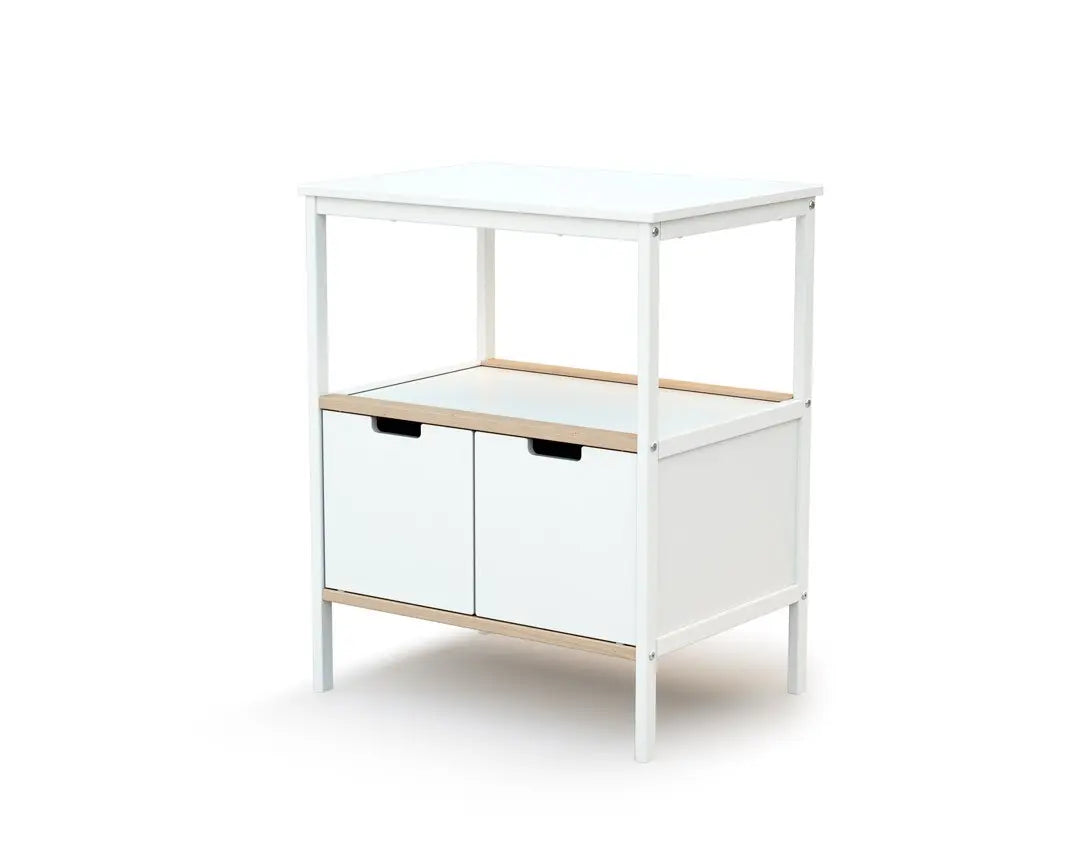 Un meuble à langer moderne et pratique : avec une large étagère ouverte en partie haute et 2 portes pour fermer la partie basse, il présente un espace de rangement ergonomique.