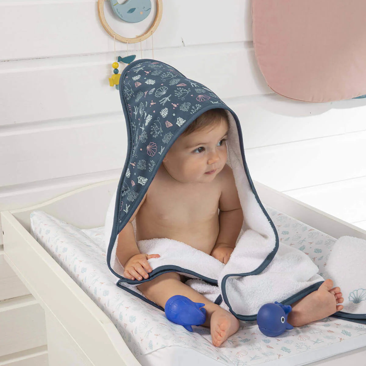 La parure de bain pour bébé Seaside Romance contient une cape de bain en éponge avec capuche imprimée de 70x70 cm et son gant de toilette assorti de 15x21 cm.