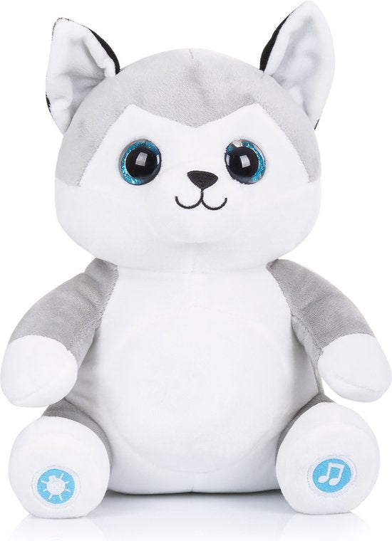 La veilleuse « Huskey » de Chipolino sert d'entraîneur au sommeil pour votre bébé. Les enfants sont apaisés par les douces berceuses aux mélodies apaisantes. Appuyez sur les pattes du husky en peluche et le ventre de l'animal en peluche commence à s'éclairer de différentes couleurs et 3 mélodies démarrent l'une après l'autre.