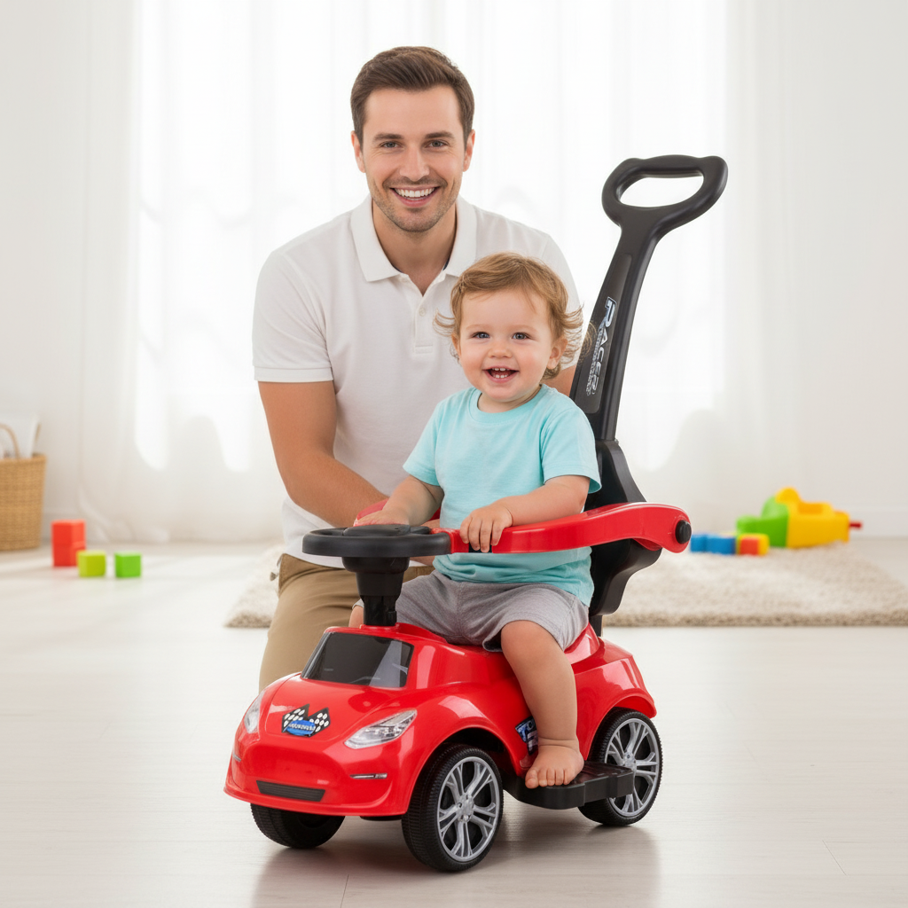 Le parent pousse l’enfant à l’aide de la poignée ;