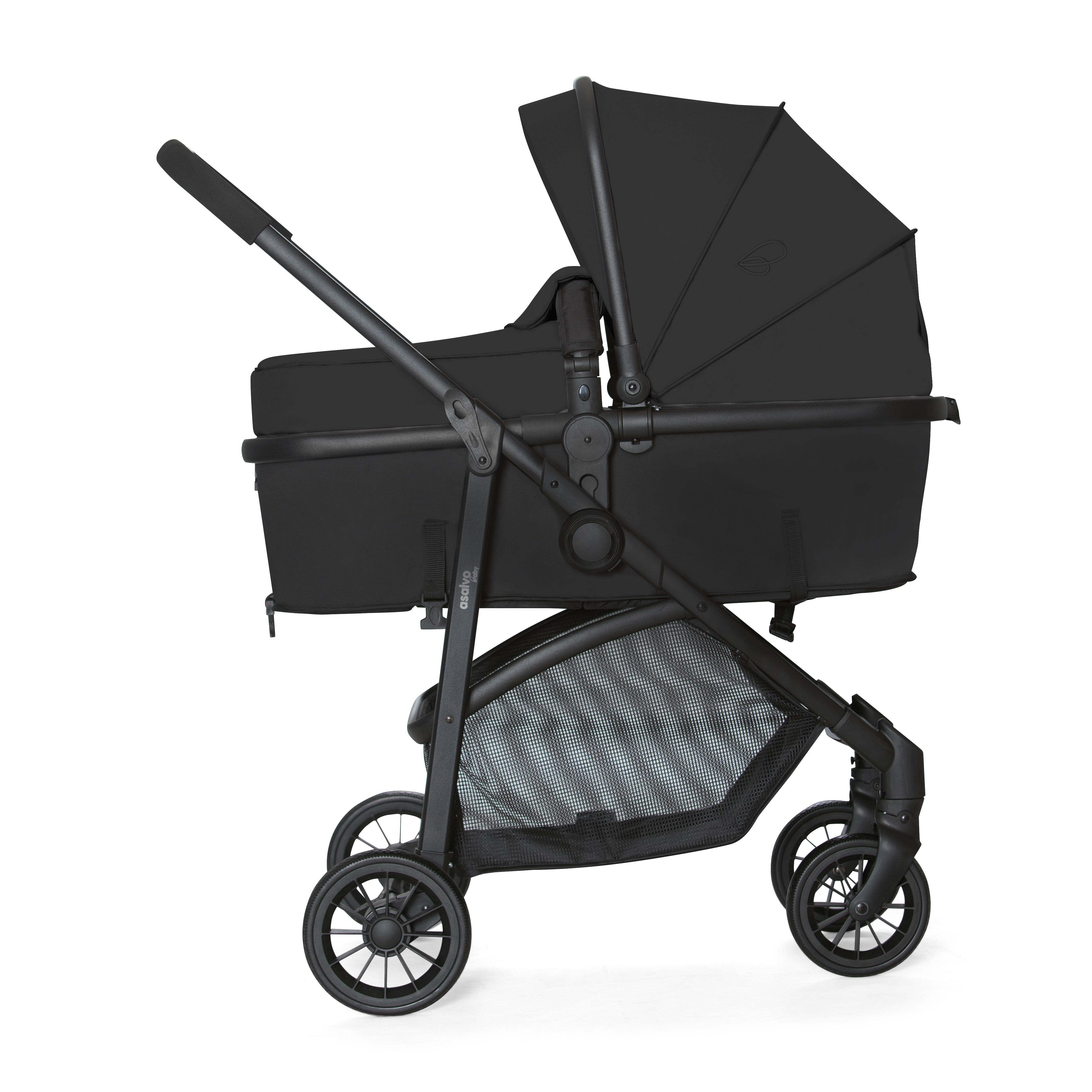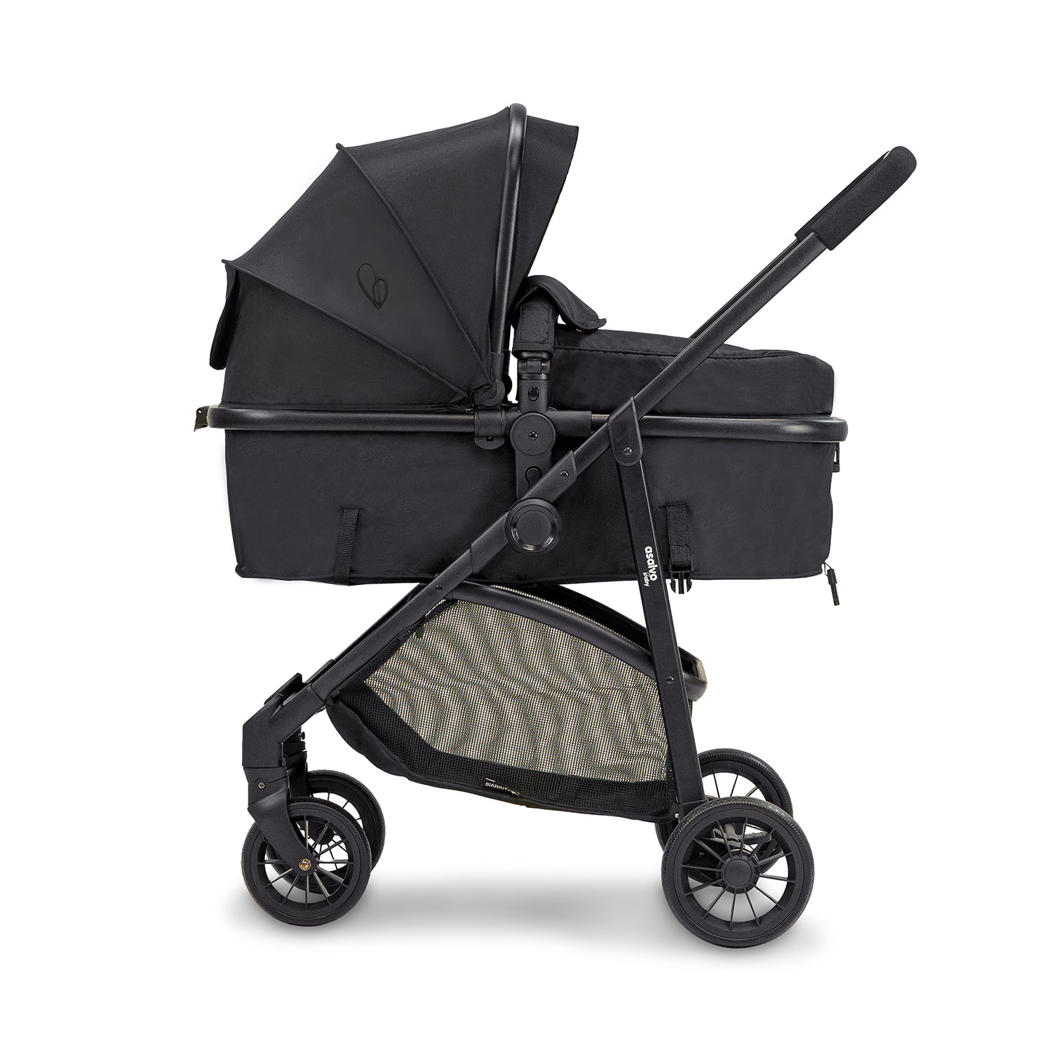 Avec un châssis robuste en acier, convient de la naissance à 22 kg. Comprend un châssis, un siège convertible en nacelle, une chancelière et un siège auto R129 pour les bébés de 40 à 87 cm. Freinage central, siège réversible, dossier multipositions avec harnais 5 points et capot extensible avec fenêtre d'aération, étanchéité et protection UV. Elle dispose également d'un panier de rangement spacieux, d'une suspension à quatre roues et d'un pliage très compact.