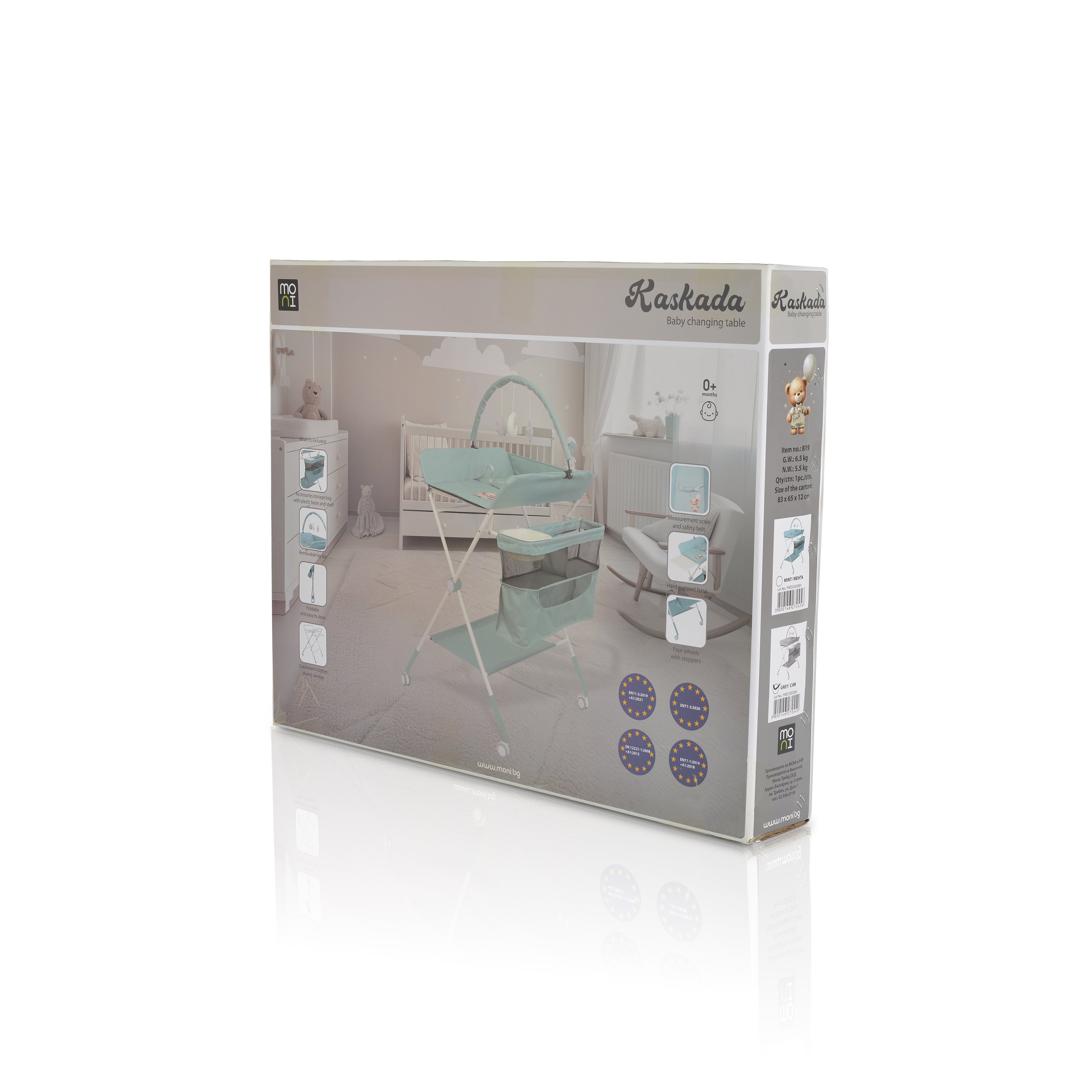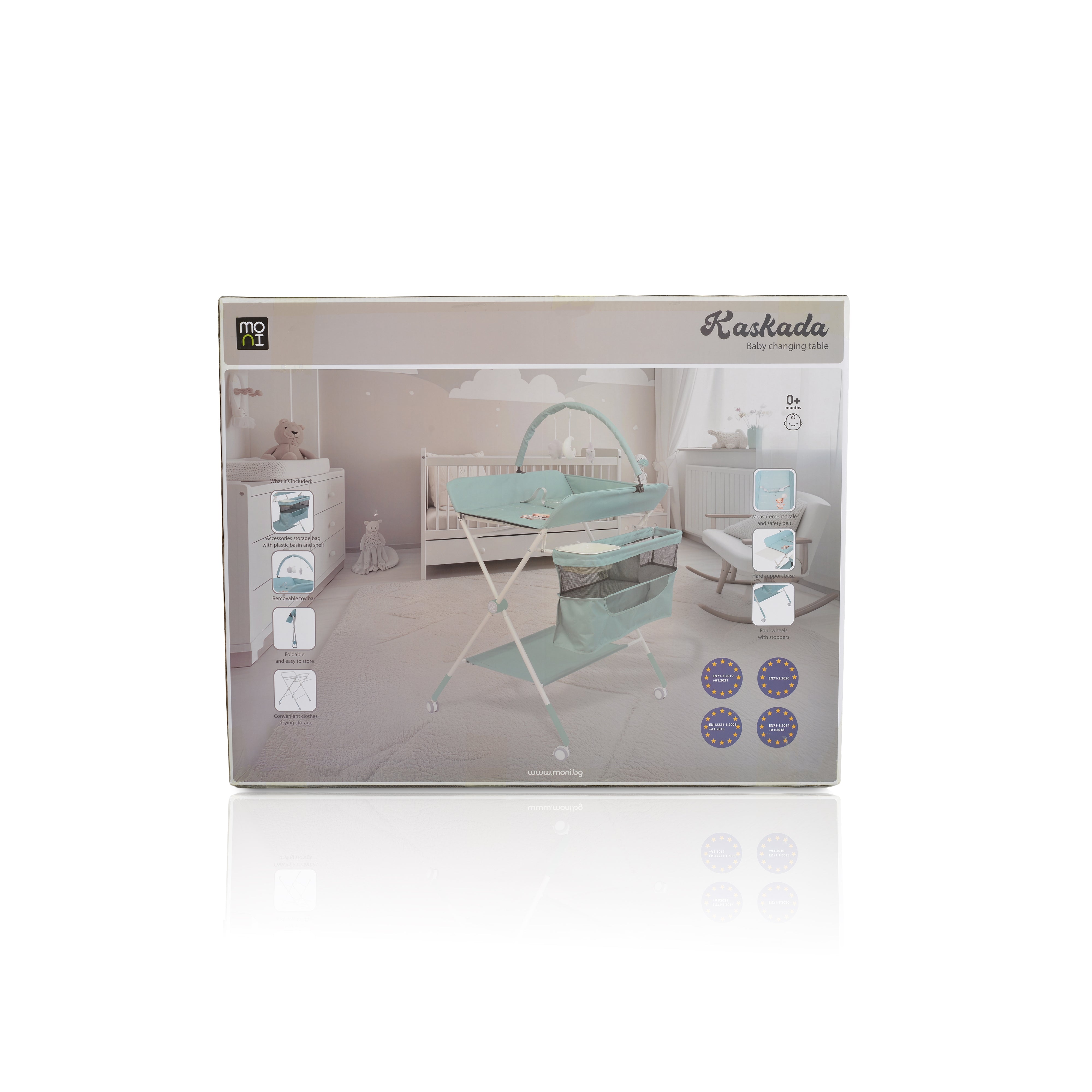 La table à langer multifonction Kaskada de Moni est votre compagnon idéal pour les soins quotidiens de bébé, de la naissance jusqu'à environ 12 mois (15 kg maximum).
