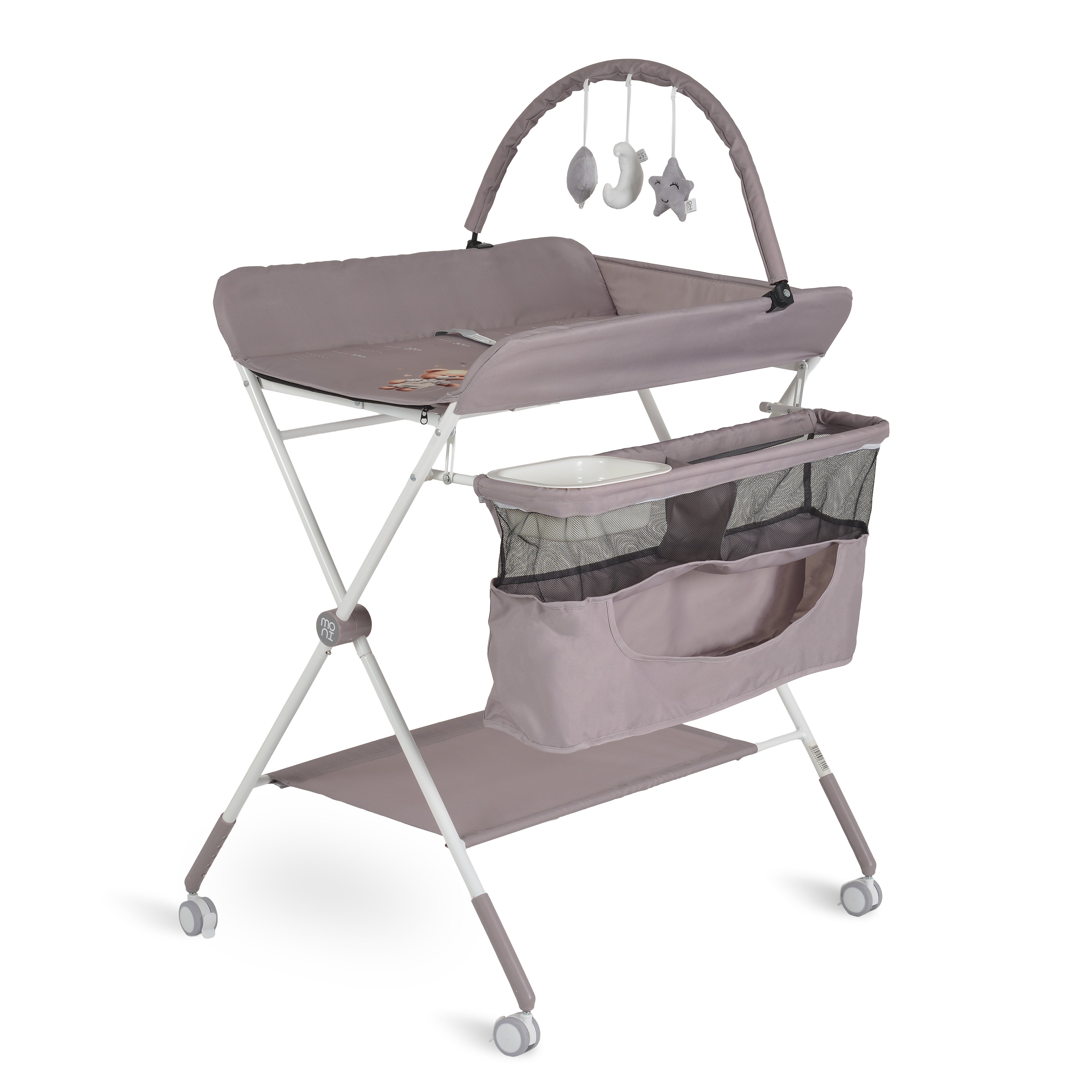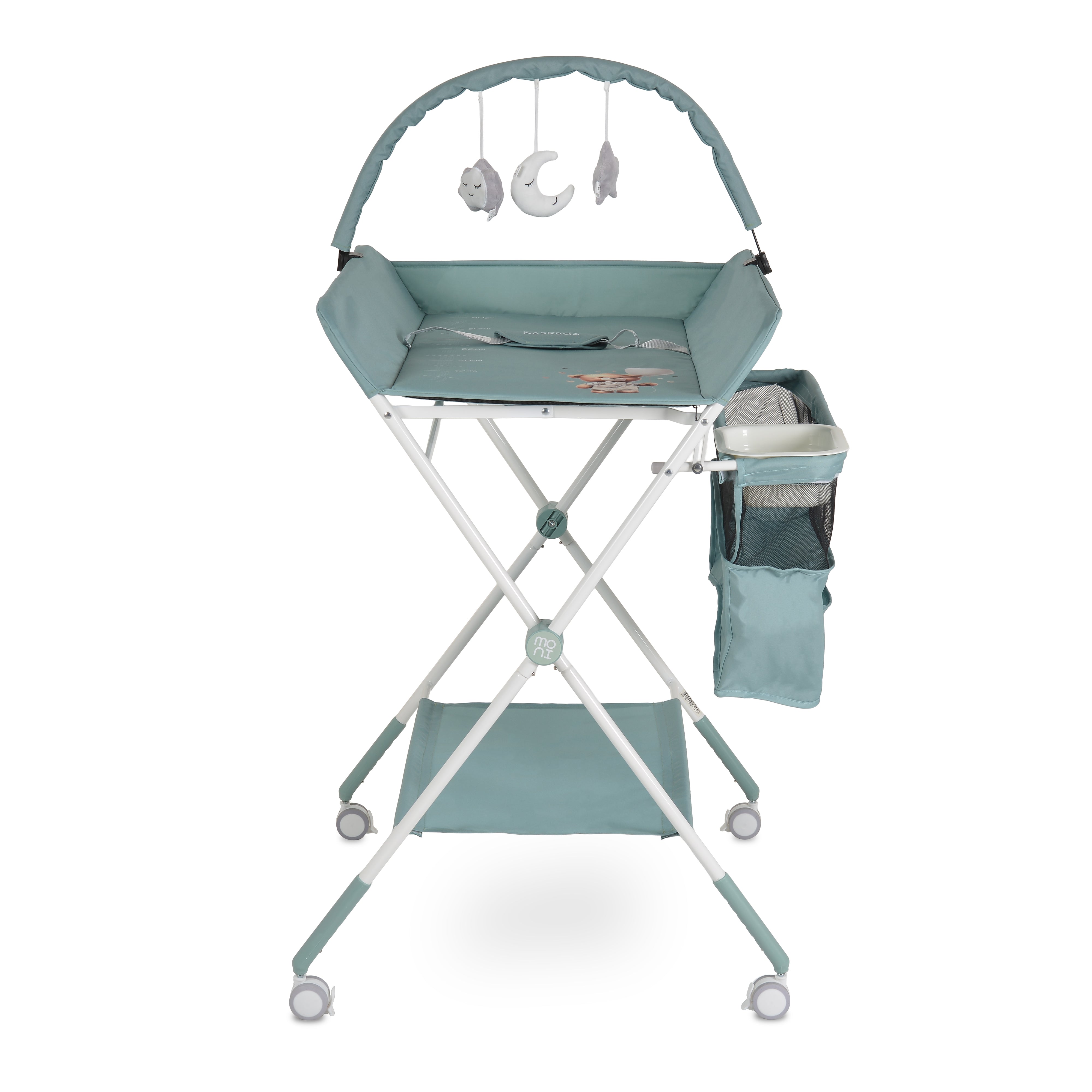 Son design ludique orné d'un ours et d'une échelle de croissance, associé à ses 4 roues avec freins, en fait une solution pratique et sécurisée. Avec son organiseur de rangement et son étagère inférieure, elle centralise tous vos essentiels.