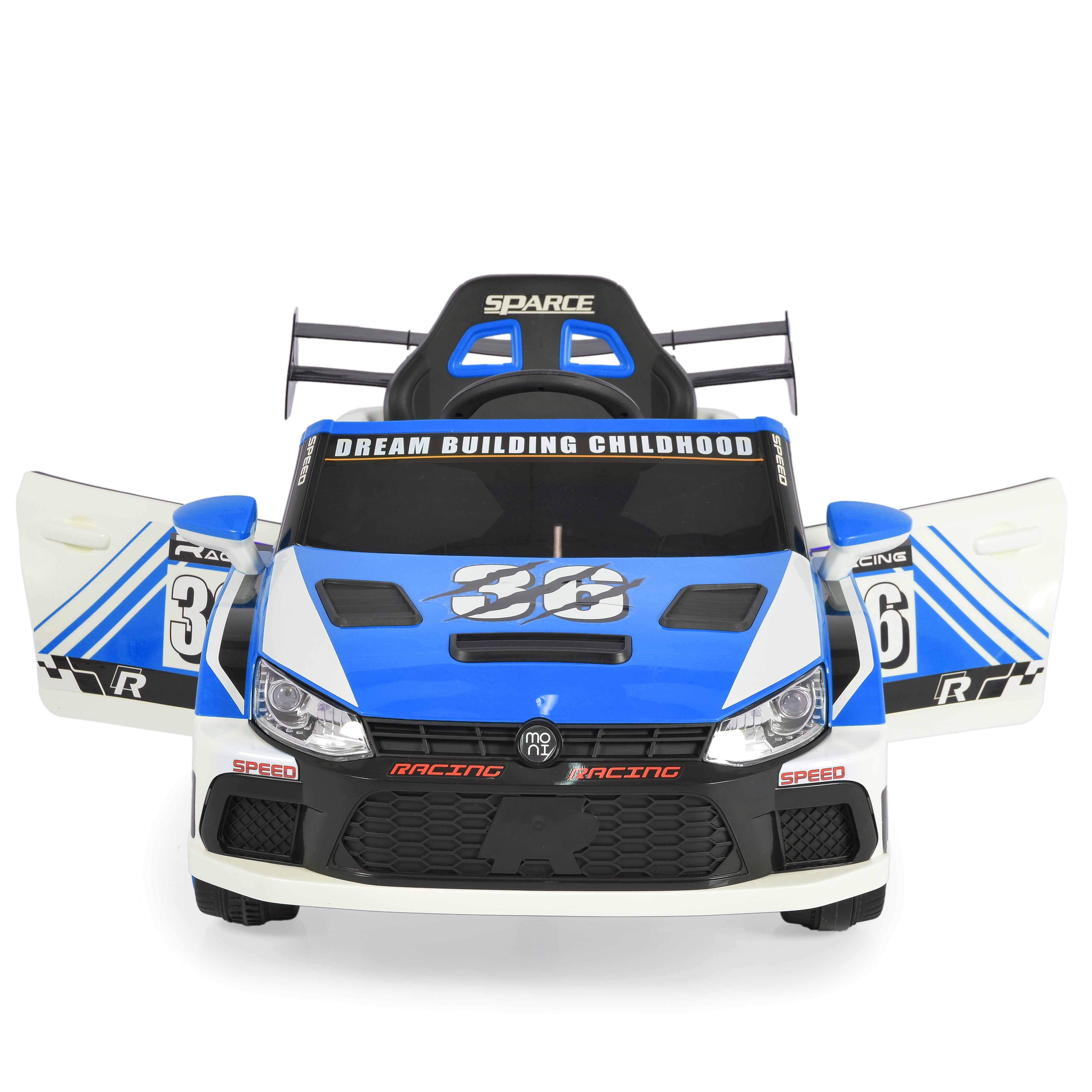 Les portes s'ouvrent facilement et la batterie 12V/7Ah assure des heures de plaisir. Dimensions : 114 x 54 x 29 cm.